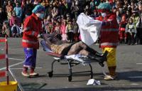 Tanzende große und kleine Räuber/Innen überfielen anschließend den Marktplatz, um dem Kaiser die Schatzkiste zu rauben und die Zuschauer/Innen mit einem Tanz zu begeistern. Das Spektakel hatte sich der Breisacher Damenzunftrat einfallen lasssen. Extrem unsportlich fählte sich sicher so mancher Narr bei der Lara- Croft- Show der Förderriege des TV- Breisach. Und auch die Ägypterinnen von „Tanz und Bwewegung“ riefen rhythmisch ins Bewußtsein, dass man ohne Sport schnell zur Mumie verkommt. Unter der Leitung von Ramona Schmidt zeigten die Brisacher „Kläpperle Buebe“, unter denen übrigens auch Mädchen sind, das ma mit zwei Holzbrettchen klappern und dabei gleichzeitig tanzen kann. Die „Gaukler- Kinder“ zeigten bei ihrer Einradshow „Punker und Rocker“, dass auch junge Narren schon voller Opferbereitschaft zur Sache gehen. Zwei der beteiligten Mädchen radelten mit Gipsarm! Einen Ausflug in den Osten Europas machten die Panduren aus Hochstetten bei ihrer Aufführung „Tanz der Geigen“. Die Guggenmusik „Schädelfätzer“ zeigte zum einen, dass schräg auch schön sein kann und zum anderen, dass man sich bei der Männergugge keine Nachwuchssorgen machen muss. Der Dirigent des Auftritts war nämlich kaum größer als eine Trompete. Klassiker aus dem Kultfilm der 80er Jahre lieferten die „Blues Brothers“ der „Rhiwaldhexen“. Anschließend kämpften die „Brysacher Hofnarren“ erst mit Flatterbändern und dann mit Boxhandschuhen. Allerdings ging so mancher Zuschauer schon beim Anblick des Nummerngirls k. o.! Atemberaubend war der Auftritt des Motorrad- Artisten Mike Auffenberg aus Thüringen, der bereits im vergangenen Jahr gezeigt hatte, wie es aussieht, wen jemand wirklich Motorrad fahren kann. Den Höhepunkt seiner PS- Show bildete der Sprung über ein mit mutigen Hofnarren besetztes Riesenquad. Gefühlt 1000 bunte Clowns bevölkerten anschließend den Platz. Wie es Sabrina Mastrocola gelungen ist, mit der vielköpfigen Rasselbande einen Tanz einzustudieren, bleibt ihr Geheimnis. Allein das Nähen der Kostüme muss Jahre gedauert haben. Der langen Tradition der Fasnacht in Breisach war das Narrennest „Algerio“ auf die Spur gekommen. In einer Steinzeithöhle hatten sie mit Hilfe von Stadtarchivar Uwe Fahrer den Urnarren entdeckt.