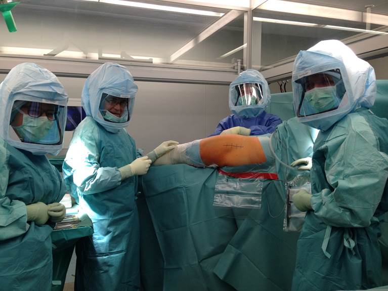 Von dem Kasten an der Decke des OP strömt sterile Luft von oben nach unten, so dass die Umgebung vom OP-Gebiet steril ist, da durch das Tragen von Astronautenhelmen auch von uns keine Bakterien in die Luft gelangen.