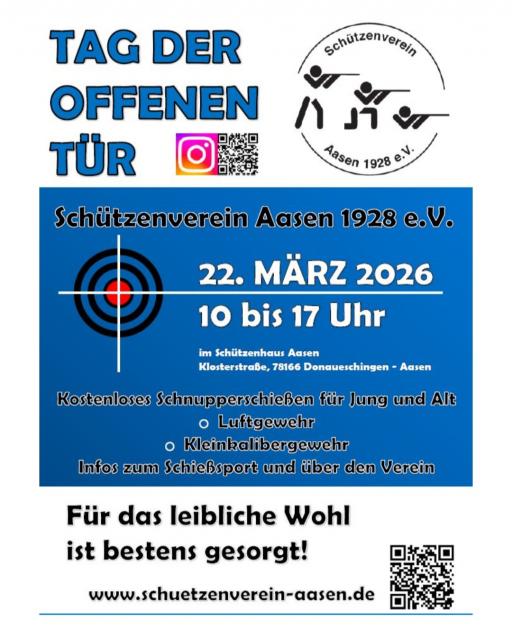 Der Schützenverein Aasen 1928 e.V. veranstaltet aus Anlass seiner Jahreshauptversammlung am Sonntag, den 22. März 2026 von 10.00 Uhr bis 17:00 Uhr einen Tag der offenen Tür. Es wird kostenloses „Schnuperschießen“ für Jung und Alt per Luftgewehr und Kleinkalibergewehr sowie Informationen zum Schießsport und zum Verein angeboten. Der Vereinsvorstand hat dazu alle Mitglieder und die Freunde des Vereins eingeladen.