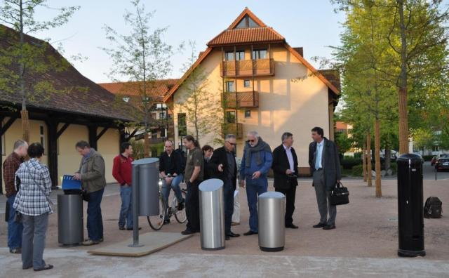 Ohne den Tipp von Roswitha Heitzler (CDU) - VIER Mülleimer stehen zur Auswahl! – hätte der Autor dieses Artikels felsenfest geglaubt, dass auch das schwarze, zylindrische Gebilde neben den VIER Mustertonnen, die auf dem Gutshofplatz ausgestellt waren, ein Designabfallbehälter ist. Es handelt sich aber um den Anschlussmultifunktionssockel für Veranstaltungen.