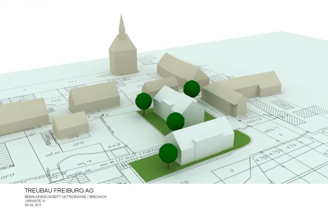 Stein des Anstoßes für den Gestaltungsplan Münsterberg war und ist ein von der TreuBau AG Freiburg projektierter Wohnkomplex an der Kettengasse. Die beiden in Anlehung an den Bauhaus- Stil konzipierten gläsernen Wohnkuben waren bei vielen Breisachern/Innen auf wenig Gegenliebe gestoßen. Nach einer Unterschriftenkampagne einer eigens gegründeten Bürgerinitiative waren die zwei Wohngebäude letztlich auch beim Denkmalamt durchgefallen.Ein völlig neues Konzept präsentierte nun der völlig neue Breisacher Architekt Michael Fischer, den die TreuBau AG zum Zwecke der Neuplanung völlig neu beauftragt hatte. Fischer hat in der Europastadt bereits Projekte wie die „Wohnvilla“ am Neutorplatz sowie Wohn- und Geschäftshäuser an der Kupfertorstraße realisiert.„Der ist hier bestens daheim“, so das Argument des Freiburger Baukonzerns für den Breisacher Architekten, der in der Tat auf dem Münsterberg daheim ist.Die neue Bauvariante sieht zum einen einen völlig neuen Haustyp vor. Statt der modernen Wohnwürfel kommen die zwei Gebäude nun mit einem stilistisch unbedenklichen Satteldach mit 40° Neigung und wesentlich kleineren Fenstern daher. Die Kröte mit dem Wohnflächenverlust von rund 100 m² hatte die TreuBau AG zwangsläufig geschluckt. Auch eine deutlich niedrigere Traufhöhe von lediglich 6 Metern nimmt der Bauträger nun billigend in Kauf. Allein die Firsthöhe bleibt bei stattlichen 11 Metern. Von drei Vollgeschossen schrumpfen die Gebäude auf zwei plus Dachgeschoss zusammen. Damit der Blick von Unten auf den Radbrunnen, Teil der typischen Silhouette des Münsterberges, gewährleistet bleibt, kommt die zweite Veränderung ins Spiel: Der Grundstückstausch. Statt wie bisher beabsichtigt, die zwei Wohnhäuser auf dem von der Stadt erworbenen Grundstück nebeneinander zu setzen, soll nun die eine Hälfte des Grundstückes dem Theresianum als zusätzlicher Schulhof zur Verfügung stehen und damit unbabaut bleiben. Lediglich der Grundstücksteil an der Ecke Kettengasse/ Pforrgasse wird mit einem Gebäude bebaut. Und auch hier bleibt der bisher unbebaute und archäologisch interessante Grundstücksteil  direkt an der Pforrgasse gebäudefreie Gartenfläche. Das zweite Haus wandert nun planerisch auf den Spielplatz unterhalb des eigentlichen Baugrundstückes, der bisher der Stadt gehört und dem Theresianum als Mini- Sport- und Spielplatz dient. Durch den Tausch der Grundstücke bekommt das Theresianum nun einen einheitlichen Schulhof und auch die befürchtete Sicherheitsgefährdung der Schüler/Innen durch den neuen Anlieger/Innenverkehr in die Tiefgarage der Wohnhäudser wäre so vorgebeugt, strich Bürgermeister Rein die Vorteile für Stadt und Grundschule heraus. Es sei zudem, so der Bürgermeister, eine „einmalige Chance“ aus dem dreigeteilten, auf mehreren Ebenen befindlichen Schulhof nun eine neue flächenmäßige Einheit zu machen. „Die Schule wird zur Zeit über eine Nadelöhr erschlossen“, betonte auch Architekt Michael Fischer. Dieser Zustand fände mit dem Grundstückstausch, der allerdings noch vom Gemeinderat zu beschließen ist, endlich ein Ende. Lediglich Experte Klaus Humpert mochte in den allgemeinen Begeisterungschor nicht vollends einstimmen. Der einmalige Ausblick nach Westen, so der Professor, sei durch den Gebäudequerriegel verloren. Und auch den dann gewissermaßen von Wohngebäuden eingerahmten Schulhof sah der ehemalige Freiburger Planungsamtsleiter nicht unkritisch. Eventuelle Beschwerden wegen Kinderlärms und erforderliche Lärmschutzmaßnahmen sollten im Vorfeld abgeklärt werden, riet Humpert. Was die gestalterische Seite anbelangte, freute sich der Mittelalterfachmann über Fischers Änderungen hinsichtlich der Gebäudeplatzierungen auf dem Grundstück. Getreu der „Raumfiguren- Theorie“ werden diese direkt an die Straßen gesetzt.Bei den jetzigen Vorentwürfen, betonte der Bürgermeister, handele es sich um einen „Erstaufschlag“, der nun in erster Linie die Hürde im Gemeinderat nehmen müsste. Hier soll die Entscheidung über den Grundstückstausch bereits im Mai auf den Tisch kommen. Natürlich müssten auch mit der Schulleitung und der Bürgerinitiative noch weitere Gespräche geführt werden, so Rein. Vom Landrats- und Denkmalamt sei für die neuen Pläne jedoch bereits ein klares O.K. gekommen.