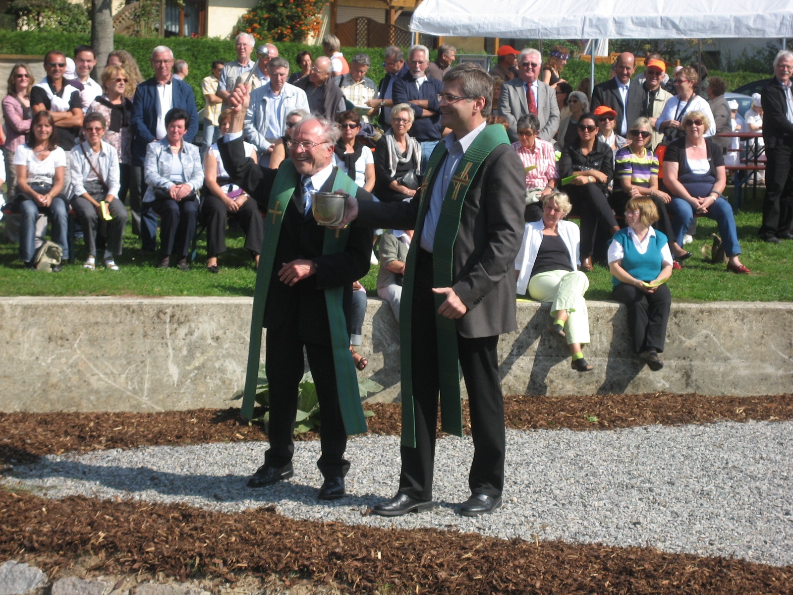 Einweihung des neuen Mühlrades In Umkirch durch die Ortspfarrer Kurt Hilberer und Fritz Breisacher