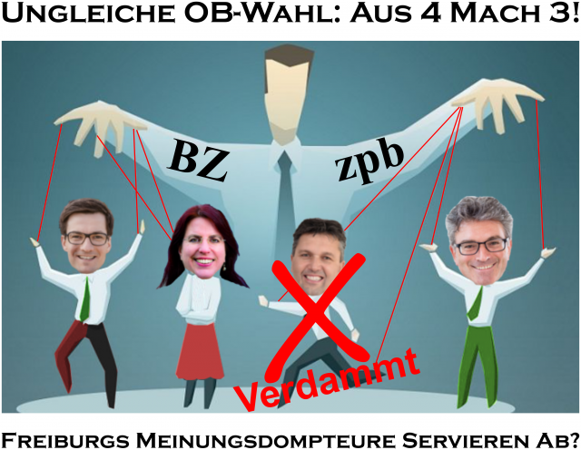 Bereits vor dem 1. Wahlgang beschwerte sich der Kandidat Anton Behringer über seine empfundene Benachteiligung durch die Medien. Nach dem Desaster des Amtsinhabers im 1. Wahlgang rückte die „Kavallerie“ an, um Salomon zu unterstützen. Die Badische Zeitung setze eine Podiumsdiskussion mit der zur strikten Neutralität verpflichteten staatlichen „Zentrale für politische Bildung“ an. Deren Freiburger Zweigstellenleiter Michael Wehner hatte sich mit seiner (falschen) Wahlprognose vor dem 1. Wahlgang weit aus dem neutralen Fenster gelehnt und auch in der Folge zu wenig Distanz zum Meinungsmacher und „Kooperationspartner“ Badische Zeitung gezeigt. Anton Behringer wurde zur Podiumsdiskussion gar nicht mehr eingeladen und man riskierte damit eine aussichtsreiche Wahlanfechtung wegen der Beteiligung von Amtspersonen an der vermeintlichen Verletzung der Chancengleichheit der Kandidaten. Behringer monierte dies massiv. Die Beteiligten zeigten Einsicht, Salomon und Horn wollten wohl einer Wahlanfechtung keine Gründe liefern und zogen ihre Zusagen zur Teilnahme im E-Werk zurück. Die Podiumsdiskussion wurde abgesagt. Behringer gab daraufhin auf und empfahl seinen Wählern Martin Horn. Seine Begründung ist eine Anklage.