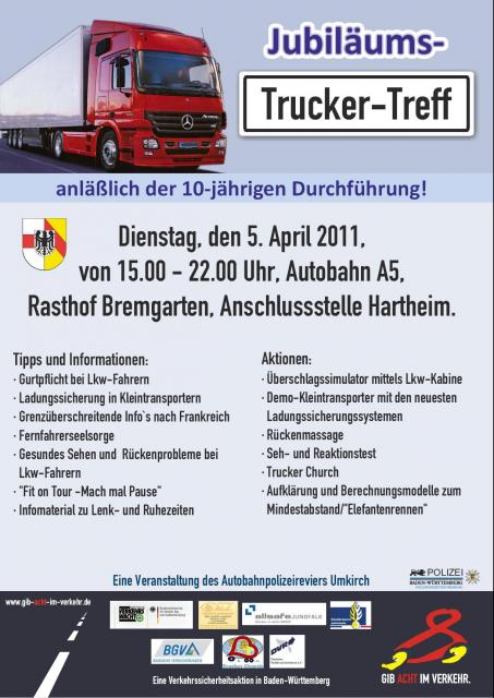 Auf dem Autobahnrasthof Bremgarten an der A5 findet am Dienstag, den 5. April 2011, der erste „Trucker- Treff 2011“ des Autobahnpolizeireviers Umkirch statt. Zwischen 15:00 und 22:00 Uhr können sich alle Brummi- Fahrer (m/w), aber auch interessierte Autofahrer/Innen über Wissenswertes rund um den Job im LKW informieren. Natürlich stehen Themen wie Fahrsicherheit und Unfallvermeidung im Vordergrund. Aber es gibt auch Vorträge zu Gesundheit am Steuer und zahlreiche Aktionen.