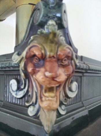 Löwen-Kopf im Meissner Jugendstil-Kachelofen im "Zum Küfer"