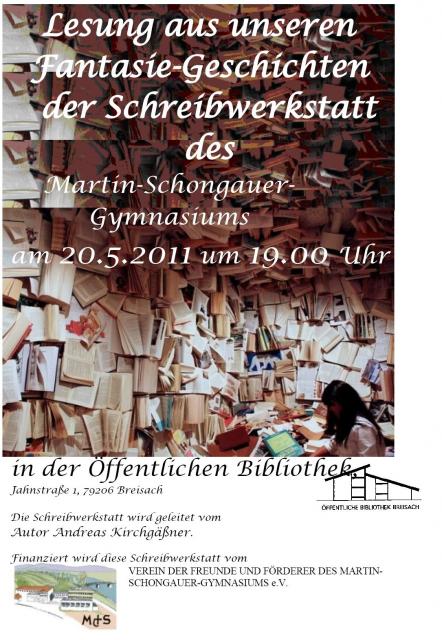 Zu einer Lesung mit Schüler/Innentexten laden das Martin- Schongauer- Gymnasium und die Stadtbibliothek Breisach am Freitag, den 20 Mai 2011, in die Räume der Stadtbibliothek ein. In Zusammenarbeit mit dem Autor Andreas Kirchgäßner haben Schülerinnen und Schüler der Klassenstufen fünf bis sieben eigene Texte erarbeitet, die sie in der Lesung vorstellen werden. Bereits seit 2007 bietet das Breisacher Gymnasium eine Schreibwerkstatt an.