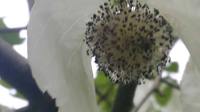Der bezaubernde Blütenkopf der „Davidia involucrata“ mit den weißen Hochblättern.