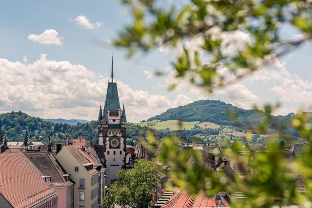 Das Freiburger Martinstor mit Blick auf den Schönberg