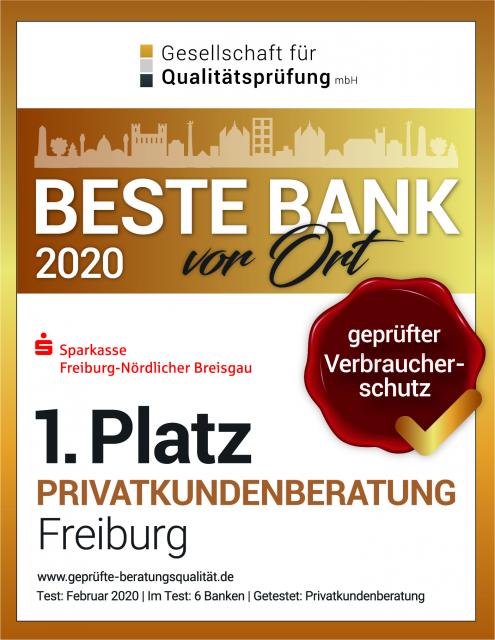 Qualitäts-Triple mit Bestnote SEHR GUT für Sparkasse Freiburg-Nördlicher Breisgau: Beste Bank vor Ort nach Qualitäts-Test.  17197  24.08.2020