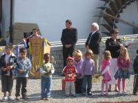 Zu einem Grußwort trat daraufhin der Bürgermeister von Bruges, Bernard Seurot, ans Rednerpult. Umkirch, so Seurot scherzhaft, empfange seine Gäste „mit der Sonne von Bruges“. Aus der Partnerschaft sei in 20 Jahren eine Freundschaft geworden und Zeichen dieser Freundschaft wäre, dass auf Worte auch Taten gefolgt seien, so zum Beispiel die Spende für den Bau des neuen Mühlrades. Neben dem gelungenen Fest lobte Seurot insbesondere das Brot von Bäcker Gustav Danzeisen, das mit dem Aroma der Freundschaft zwischen Umkirch und Bruges „gewürzt“ sei. Allein, Forellen hätte er im Mühlbach noch keine gesehen, diese müsse man wohl nächstes Mal aus Bruges mitbringen.Natürlich durfte auf dem Fest das Lied von der Klappernden Mühle am rauschenden Bach nicht fehlen. Es wurde von den Kindern des Kindergartens „Regenbogen“ gesungen.