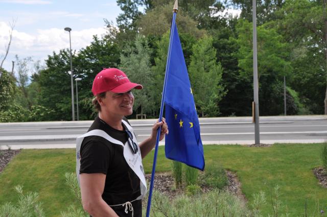 Brav mitmachen: Sascha Wussow mit Europaflagge