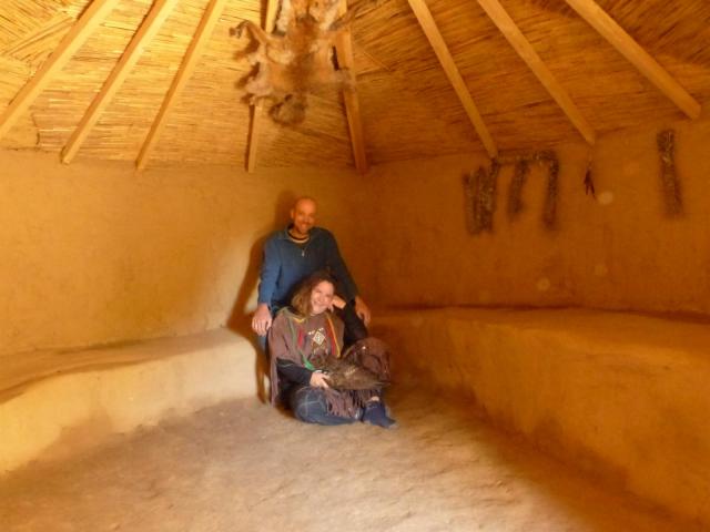 Die Idee die Jurte zu bauen sei Eva-Maria spontan gekommen. „Wie meine Frau so ist“, sagte Evas Mann Frank, „hat sie ihre Pläne direkt in die Tat umgesetzt. Als ich sie nach langer Suche im Garten gefunden habe, hatte sie schon die Ecksteine gelegt und zu graben begonnen.“ Eva-Maria ergänzte: „Frank war zuerst verwundert, habe sich aber alsbald eine Schaufel geschnappt und mitgeholfen“. Der Bau der kreisrunden Jurte hat die beiden Heimwerker in partnerschaftlicher Zusammenarbeit etwa ein Jahr begleitet. Sie ähnelt einem großen Zelt, ist aber auf knapp einen Meter in den Erdboden eingegraben und an den Wänden und am Fußboden mit Lehm bekleidet; das Dach ist ein Holzgerüst, das mit Abdeckfolie und Schilf abgedichtet ist. Im Zentrum des Daches befindet sich ein Loch, das mit einer sich darüber befestigten Metallscheibe gegen Regen geschützt ist. Somit werden die Insassen der Jurte – auch bei intensiver geistiger Arbeit – stetig mit frischer Luft versorgt. Die schamanische Behausung bietet Platz für ungefähr 20 Personen. Wie bei der Einweihung bewiesen wurde, ist sie Regenfest und für den Winter beheizbar. Künftig sollen dort jeden ersten Samstag im Monat Seminare mit schamanischem Hintergrund auf Spendenbasis stattfinden. Gäste sind dabei herzlich willkommen und können Informationen dazu auf Eva-Maria Schönes Homepage finden oder per Telefon anfragen (http://www.licht-medium.de).