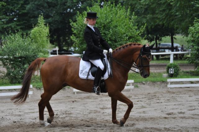„Nur gut mit Hut“ könnte das Motto beim Dressurreiten lauten. Beim Reitturnier des Breisacher Reit- und Fahrvereins wurde die Disziplin, die dem Laien wie eine Art Square Dance für Pferde mit Reiter/In im Opernballdress anmutet, bis zur zweithöchsten, der Klasse M(ittelschwer) ausgetragen. Nach Kommandos für verschiedene Aufgaben, den Dressurlektionen, tänzeln Reiter und Pferd unter den strengen Augen der Wertungsrichter (m/w) über einen rechteckigen Sandplatz. Bewertet wird nach den Kriterien Sitz, Einwirkung auf das Pferd, Ausführung der Lektionen und Gesamteindruck.