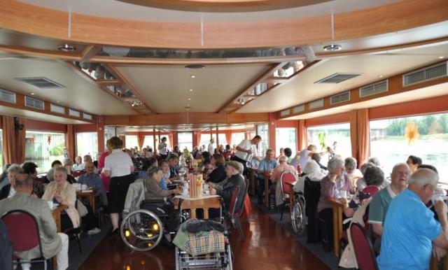 Das BSF- Fahrgastschiff „Weinland Baden“ war mit 230 Seniorinnen und Senioren denn auch bis auf den letzten Platz ausgebucht, als es pünktlich um 14 Uhr 30 in Breisach ablegte. Umsorgt vom flinken Bordpersonal und unterstützt von den Helfern/Innen von Evangelischer Stadtmission, AWO und Stadtseniorenbeirat Breisach sowie den Schwesterorganisationen der französischen Nachbarn, hatten denn auch alle Fahrgäste bereits Kaffee und Kuchen vor sich stehen, bevor sie von Chefsteward „Victor“ alias Bürgermeister Oliver Rein an Bord begrüßt wurden.