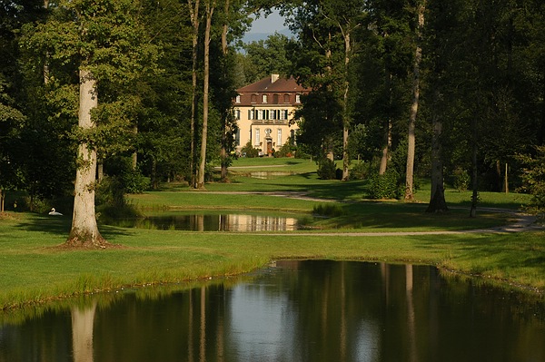 Baum-Tunnel mit Sichtachse und Licht-Höfen über das Wasser zum Schloss. über dem Schloss ist der Himmel geöffnet