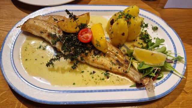 Bretonische Seezunge aus dem Fischlokal "Poseidon" am weltberühmten Münchner Viktualienmarkt.