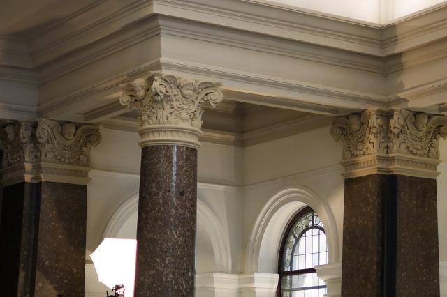 Begleitung ins Jenseits: Engel und Cherubim auf den tragenden Säulen der Säulenhalle des Friedhofsdoms in Freiburg.