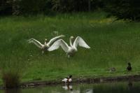 Die Umkircher Singschwäne steigen für ihre Flugrunden immer wieder in den Umkircher Himmel auf, doch sie blieben dem Queen-Auguste-Victoria-Park treu. Schwäne zählen zu den Welt-Meistern der Monogamie; ein Schwanen-Paar bleibt sich lebennslang treu. Dieses Jahr hat sich das Singschwäne-Paar für die Geburt ihrer Jungen Christi Himmelfahrt ausgesucht. An diesem 40. Tag des Osterfestkreises feiern die Christen die Rückkehr Jesu Christi als Sohn Gottes zu seinem Vater in den Himmel. Nach 35 Brut-Tagen erblickten am 17.5.2012 vier junge Singschwäne in Umkirch das Licht der Welt. Wie der Name schon sagt, kann der Singschwan ausdrucksvoll singen. Aus dieser Eigenschaft leitet sich seit der Antike die metaphorische Gleichsetzung des Schwans mit dem Dichter her. Singschwäne sind auch auf der finnischen 1-Euro-Münze abgebildet. Die Singschwäne (Wissenschaftlicher Name Cygnus cygnus) gehören zur Familie der Entenvögel in der Gattung der Schwäne. Es sind Brutvögel der osteuropäischen und sibirischen Taiga. In Umkirchs Queen-Auguste-Victoria-Park wurden vor rund 15 Jahren zwei Pärchen Singschwäne ausgesetzt. Sie brachten inzwischen zahlreiche Jungen zur Welt. Jedes Jahr werden die Jungschwäne (wenige Tage nach ihrer Geburt) schon Opfer von Raubvögeln. Im letzten Jahr hat nur ein Jungschwan überlebt. Dennoch ist das Ensemble des Umkircher "Singschwan-Orchesters" in den letzten Jahren auf insgesamt 12 Mitglieder (Singschwäne) angestiegen. Nachdem Park-Fotograf Achim Keller die Schwäne aufgenommen hatte beobachtete auch Singschäne-Fotograf Werner Trageiser Umkirchs Entenvögel; es gelangen ihnen erstaunliche Schnappschüsse.