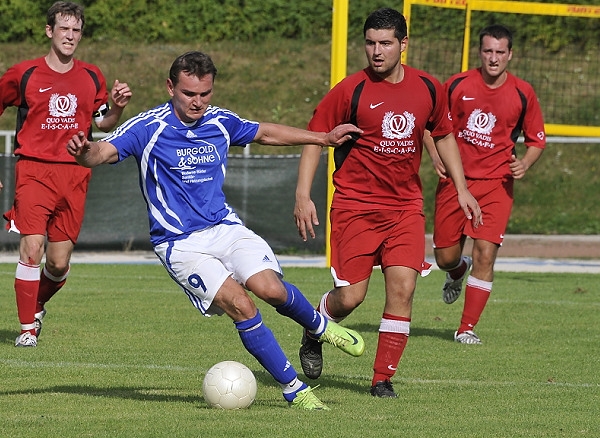 Der Fuß des Blau-Weißen war schneller als Körper des Roten (Bild: Achim Keller)