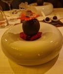 Geßler bot eine moderne Interpretation der Schwarzwälder Kirschtorte: als Kugel mit Sauerkirschkern, weißer Schokoladenganache und zweierlei Ummantelungen. Serviert wurde sie auf einem Sauerkirschgranité, ergänzt durch Schokoladensponge, Kirschwasser-Gel, Zuckerelemente und ein gebackenes Herbstblatt.