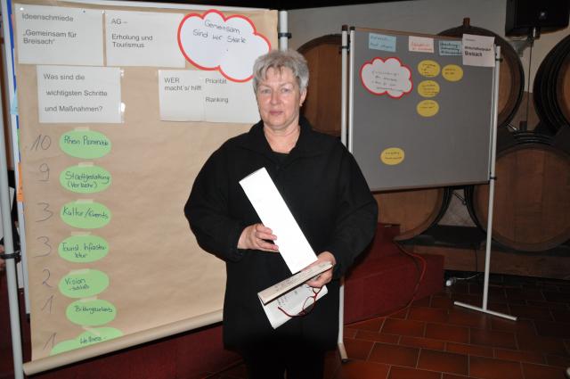 Auf der Wunschliste der Gruppe Innenstadtentwicklung tauchte überraschenderweise das Thema Verkehrsberuhigung wieder auf. Ebenso wurden Wünsche nach einer Verknüpfung zwischen Rhein und Innenstadt sowie nach einem gemeinsamen Auftrittskonzept für den um seine Existenz ringenden Einzelhandel laut. Auch bei der Gruppe Wirtschaftsstandort Breisach wurde die Bedeutung des Einzelhandels für den Charme einer lebendigen Innenstadt betont. Beklagt wurden die zerstreuten, teils halbfertigen Breisacher Gewerbegebiete. Ein gezielter Entwicklungsplan für Handel und Gewerbe sei deshalb dringend notwendig. Im Arbeitskreis Erholung& Tourismus stand die Verbesserung des Zustandes der Rheinpromenade auf dem ersten Platz, dicht gefolgt von, wen wundert´s, der Stadtgestaltung inklusive Verkehrsberuhigung. Weitere eher visionäre Anregungen waren unter anderem ein Fahrstuhl auf den Münsterberg (auch diese Idee prangte bereits zu Zeiten der Gemeinderatswahlen im vergangenen Jahr auf den Flyern der Breisacher FDP) sowie der Wiederaufbau des Breisacher Schlosses. Aber auch originelle und vor allem kostengünstige Ideen, wie Führungen durch die historischen Kellergewölbe der Radbrunnenallee fanden sich unter den Ideen der Tourismusgruppe.