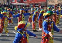 Tanzende große und kleine Räuber/Innen überfielen anschließend den Marktplatz, um dem Kaiser die Schatzkiste zu rauben und die Zuschauer/Innen mit einem Tanz zu begeistern. Das Spektakel hatte sich der Breisacher Damenzunftrat einfallen lasssen. Extrem unsportlich fählte sich sicher so mancher Narr bei der Lara- Croft- Show der Förderriege des TV- Breisach. Und auch die Ägypterinnen von „Tanz und Bwewegung“ riefen rhythmisch ins Bewußtsein, dass man ohne Sport schnell zur Mumie verkommt. Unter der Leitung von Ramona Schmidt zeigten die Brisacher „Kläpperle Buebe“, unter denen übrigens auch Mädchen sind, das ma mit zwei Holzbrettchen klappern und dabei gleichzeitig tanzen kann. Die „Gaukler- Kinder“ zeigten bei ihrer Einradshow „Punker und Rocker“, dass auch junge Narren schon voller Opferbereitschaft zur Sache gehen. Zwei der beteiligten Mädchen radelten mit Gipsarm! Einen Ausflug in den Osten Europas machten die Panduren aus Hochstetten bei ihrer Aufführung „Tanz der Geigen“. Die Guggenmusik „Schädelfätzer“ zeigte zum einen, dass schräg auch schön sein kann und zum anderen, dass man sich bei der Männergugge keine Nachwuchssorgen machen muss. Der Dirigent des Auftritts war nämlich kaum größer als eine Trompete. Klassiker aus dem Kultfilm der 80er Jahre lieferten die „Blues Brothers“ der „Rhiwaldhexen“. Anschließend kämpften die „Brysacher Hofnarren“ erst mit Flatterbändern und dann mit Boxhandschuhen. Allerdings ging so mancher Zuschauer schon beim Anblick des Nummerngirls k. o.! Atemberaubend war der Auftritt des Motorrad- Artisten Mike Auffenberg aus Thüringen, der bereits im vergangenen Jahr gezeigt hatte, wie es aussieht, wen jemand wirklich Motorrad fahren kann. Den Höhepunkt seiner PS- Show bildete der Sprung über ein mit mutigen Hofnarren besetztes Riesenquad. Gefühlt 1000 bunte Clowns bevölkerten anschließend den Platz. Wie es Sabrina Mastrocola gelungen ist, mit der vielköpfigen Rasselbande einen Tanz einzustudieren, bleibt ihr Geheimnis. Allein das Nähen der Kostüme muss Jahre gedauert haben. Der langen Tradition der Fasnacht in Breisach war das Narrennest „Algerio“ auf die Spur gekommen. In einer Steinzeithöhle hatten sie mit Hilfe von Stadtarchivar Uwe Fahrer den Urnarren entdeckt.