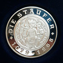 Die Medaille trägt die Inschrift „Die Staufer 1079 – 1268“ Sie zeigt das Thronbild von Kaiser Friedrich I. Barbarossa mit den Reichsinsignien des römisch-deutschen Reiches: Reichskrone, Friedenszepter, Reichskreuz und Sphaira. Die Rückseite zeigt das Wappen der drei Löwen, das seit König Heinrich VII.von den Staufern geführt wurde und das seit der Landesgründung (1952) das Wappen des Landes Baden-Württemberg ist.