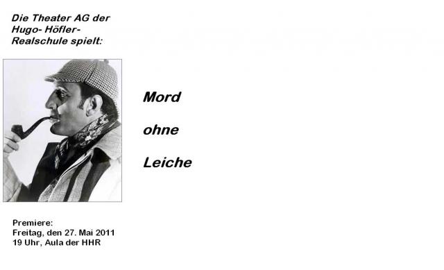 Am Freitag, den 27. Mai 2011, lädt die Theater AG der Hugo-Höfler-Realschule Breisach zur Premiere der Kriminalparodie „Mord ohne Leiche“ von Margret Völke und Rudolf Guder in die Aula der Schule ein. Beginn der Veranstaltung ist um 19 Uhr. Bei dem Krimi rund um den legendären Ermittler Sherlock Holmes sind Spannung und vor allem Spaß vorprogrammiert.