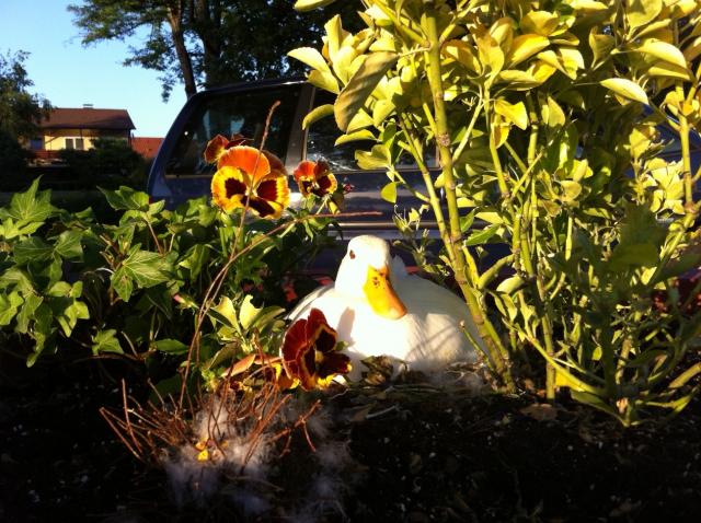 In der Kategorie „Brütende Vielfalt im Breisacher Stadtbild“ hat sich Frau Ente aus der Breisacher Rheinuferstraße etwas ganz Besonderes einfallen lassen. Statt die Stadt mit Blumen zu schmücken, schmückt Frau Ente, auch etliche Wochen nach Ostern, Blumen mit Eiern. In einem der filigranen Blumenkübel an der Breisacher Promenade, hat Frau Ente ein hübsches Nest eingerichtet und mit etlichen ovalen Deko- Artikeln verziert. Bis zur Entscheidung am 17. Juni wird sich die Blumentopfgestaltung aller biologischen Voraussicht nach aber noch verändern. Gute Chancen auf den Sieg rechnet sich Frau Ente in jedem Fall aus, wie sie der REGIONALIA- Redaktion mitteilte. Was sie allerdings mit einem Einkaufsgutschein für das Blumenhaus Güth anfängt, ist Frau Ente noch nicht ganz klar. Vielleicht gegen einen Gutschein bei Bäcker Michelbach tauschen…
