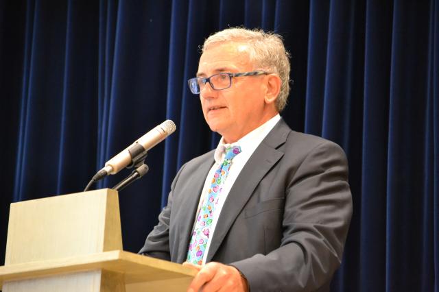 Leviten-Lesung nicht nach Levi, sondern nach Theis? Die bunte Krawatte ist Ausdruck seines farbenfrohen Geistes: Alfons Theis (Umkirch) spricht zum Abschied humorvoll zu Vorgesetzten und Untergebenen. (Bild: Katharina Kömmler)