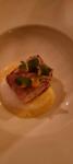 Amuse-bouche: Gebratener Yin Hau Lachs, gebackenes Kalbsbries auf Avocadospirale, Imperial Kaviar, Blutampfer und Buchweizenblinis aus Sauerteig, begleitet von einer feinherben roten Currysauce, die am Tisch aufgegossen wurde.