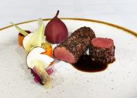 Der Rehrücken stammte aus eigener Jagd und wurde mit Tannenschlössling-Espuma im Rotkrautmantel serviert. Die Tannenschlösslinge stammten aus Geßlers Familienwald, wurden fermentiert und fanden sich auch im separat gereichten Ragout wieder. Gnocchi, feines Gemüse und eingelegte Rotweinbirnen ergänzten das Gericht. Eine feine Wildjus, mit Butter aufmontiert, rundete das Ensemble ab.