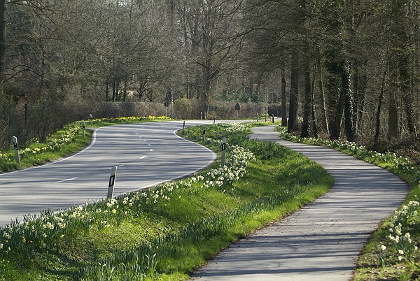 Die Landstraße vor dem Queen-Auguste-Victoria-Park weist auf das Osterglocken-Blütenwunder im Park hin