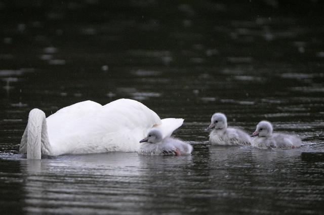 Schwanengeburt: Vier junge Singschwäne in Umkirchs Queen-Auguste-Victoria-Park