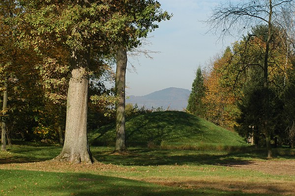 Parkschöpfung im Bilderrahmen: Der kleine und der große Kaiserstuhl und eine alte Eiche im Queen-Auguste-Victoria-Park