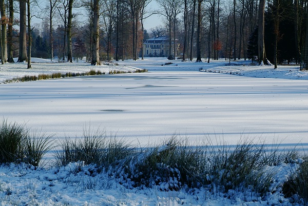 Blick über den verschneiten See zum Schloss im Queen-Auguste-Victoria-Park