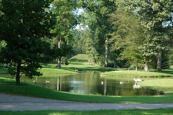 Licht und Schatten: Blick vom Schloss durch den Baumtunnel auf den Erdkegel im Fulwellpark