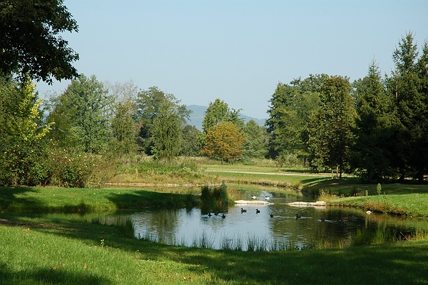 Blick über das Wasser aus dem Queen-Auguste-Victoria-Park zur in der Natur eingerahmten Spitze des Kaiserstuhls