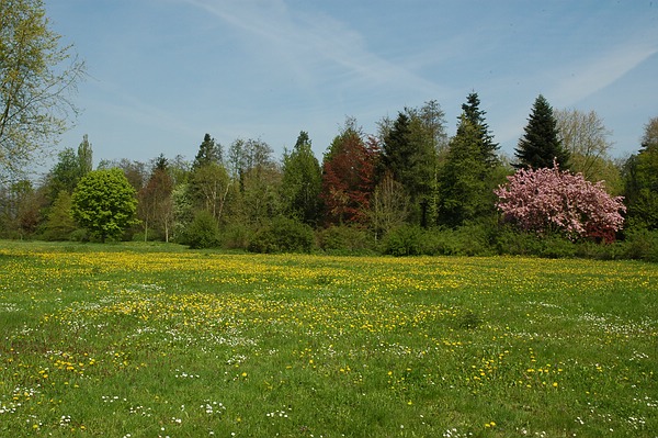 Queen-Auguste-Victoria-Park: Die Schlosswiese blüht vor der Kulisse der jungen Bäume