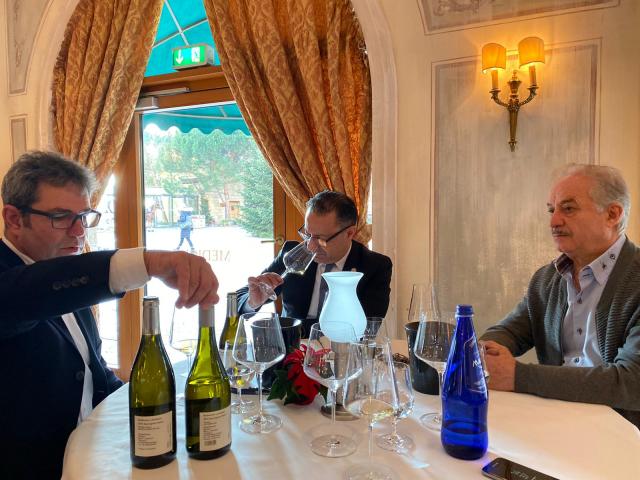 Europa-Park-Sommelier Vincenzo De Biase mit dem "Wein-Picasso" Mario Burkhart und dem Gastronom Francesco Caridi bei der Weinverkostung im Europa-Park.