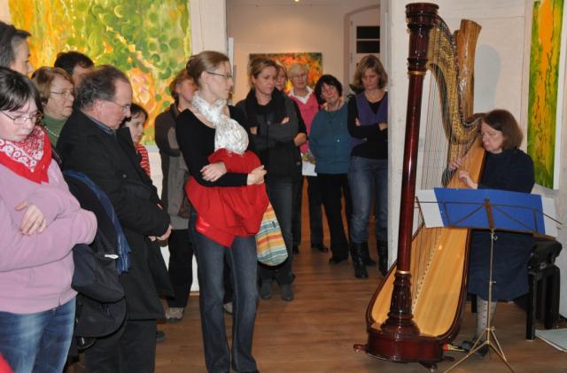 Malerei und Musik: Besucher/Innen der Vernissage und Oktavia Röhl an der Harfe