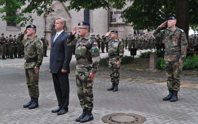 Feierliche Zeremonie: Bürgermeister Oliver Rein (2.v.l.), General Phillipe Chalmel (3.v.l) und Oberstleutnant Henning Weeke (rechts)