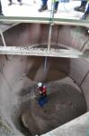 Um Koordination ging es auch im Szenario Nummer Drei, einem „Unfall“ im Kieswerk Uhl. Bei Wartungsarbeiten, so die Übungsvorgabe, war es zunächst zu einem Brand gekommen. Dabei waren drei Arbeiter in großer Höhe eingeschlossen, einer davon in ein Silo gefallen. Während die Feuerwehr mittels Drehleiter und Seil einen Arbeiter von der Anlage und einen Schwerverletzten aus dem Silo barg, hatte die THW- Höhenrettung ein Seil zur Verletztenbergung mit der Trage gespannt. Für die Bergung aus dem Silo sowie die schwankende Tragenfahrt hatten sich offensichtlich keine Darsteller/Innen finden lassen, so dass die Verletzten von Dummys „gespielt“ wurden.