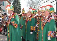 Im Eingangsbereich wurde dem ehrwürdigen Breisacher Rathaus durch fleißige Narrenhände schon mal „ein neues Gesicht verabreicht“, bevor der bestürzte Bürgermeister, aufgeschreckt durch bunte, schunkelnde Menschenmassen, aus dem Rathausfenster spähte. Zunächst befürchtete das Stadtoberhaupt eine neue Bürgerinitiative gegen Sonstwas, da die nörgelnden "Dagegen- Gruppierungen" im Moment im Ländle ja Angst und Schrecken verbreiten. Der Zunftrat rund um Oberzunftmeister Wilfried Meyer machte Rein allerdings rasch und reimend klar, dass es nicht um Lappalien wie die Kettengasse sondern schlicht um die Macht im Rathaus geht, die die Narren an sich zu reißen gedenken. Unterstützt wurden Meyers Machtansprüche durch zahlreiche maskierte Bürger/Innen und Rathausmitarbeiter/Innen, die offensichtlich schon die Seite gewechselt hatten. Musikalischen Nachdruck wurde dem maskierten Machtanspruch durch Musik der „Schädelfätzer“ verliehen.