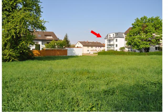 In Breisach bald überall in Sichtweite: Eine Stadtvilla (Pfeil) mit Baulücke (Wiese) auf die eine Stadtvilla kommt (Bild: J. W. Steckmeister)