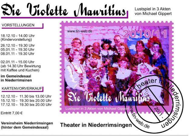 Urlaubsreif und wintermüde? Da klingt der Name Mauritius doch wie Musik in den Ohren! Das Lustspiel „Die violette Mauritius“, mit dem das Theater in Niederrimsingen in die Spielzeit 2010/ 2011 geht, handelt aber nicht von der sonnigen Insel sondern von den Irrungen und Wirrungen in einer durch eine seltene Briefmarke plötzlich zu unerwartetem Reichtum gekommenen Familie. Der Dreiakter stammt aus der Feder des Niederrimsinger Erfolgsautors Michael Gippert, der bereits mehrere Stücke für das Laientheater verfasst hat.