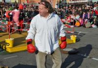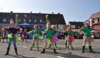 Tanzende große und kleine Räuber/Innen überfielen anschließend den Marktplatz, um dem Kaiser die Schatzkiste zu rauben und die Zuschauer/Innen mit einem Tanz zu begeistern. Das Spektakel hatte sich der Breisacher Damenzunftrat einfallen lasssen. Extrem unsportlich fählte sich sicher so mancher Narr bei der Lara- Croft- Show der Förderriege des TV- Breisach. Und auch die Ägypterinnen von „Tanz und Bwewegung“ riefen rhythmisch ins Bewußtsein, dass man ohne Sport schnell zur Mumie verkommt. Unter der Leitung von Ramona Schmidt zeigten die Brisacher „Kläpperle Buebe“, unter denen übrigens auch Mädchen sind, das ma mit zwei Holzbrettchen klappern und dabei gleichzeitig tanzen kann. Die „Gaukler- Kinder“ zeigten bei ihrer Einradshow „Punker und Rocker“, dass auch junge Narren schon voller Opferbereitschaft zur Sache gehen. Zwei der beteiligten Mädchen radelten mit Gipsarm! Einen Ausflug in den Osten Europas machten die Panduren aus Hochstetten bei ihrer Aufführung „Tanz der Geigen“. Die Guggenmusik „Schädelfätzer“ zeigte zum einen, dass schräg auch schön sein kann und zum anderen, dass man sich bei der Männergugge keine Nachwuchssorgen machen muss. Der Dirigent des Auftritts war nämlich kaum größer als eine Trompete. Klassiker aus dem Kultfilm der 80er Jahre lieferten die „Blues Brothers“ der „Rhiwaldhexen“. Anschließend kämpften die „Brysacher Hofnarren“ erst mit Flatterbändern und dann mit Boxhandschuhen. Allerdings ging so mancher Zuschauer schon beim Anblick des Nummerngirls k. o.! Atemberaubend war der Auftritt des Motorrad- Artisten Mike Auffenberg aus Thüringen, der bereits im vergangenen Jahr gezeigt hatte, wie es aussieht, wen jemand wirklich Motorrad fahren kann. Den Höhepunkt seiner PS- Show bildete der Sprung über ein mit mutigen Hofnarren besetztes Riesenquad. Gefühlt 1000 bunte Clowns bevölkerten anschließend den Platz. Wie es Sabrina Mastrocola gelungen ist, mit der vielköpfigen Rasselbande einen Tanz einzustudieren, bleibt ihr Geheimnis. Allein das Nähen der Kostüme muss Jahre gedauert haben. Der langen Tradition der Fasnacht in Breisach war das Narrennest „Algerio“ auf die Spur gekommen. In einer Steinzeithöhle hatten sie mit Hilfe von Stadtarchivar Uwe Fahrer den Urnarren entdeckt.