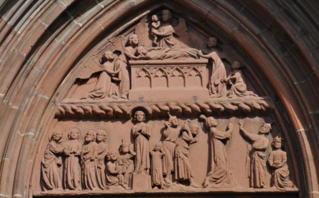 Tympanon über dem Hauptportal des Stephansmünsters: Steinigungsszene Hlg. Stephanus unten rechts