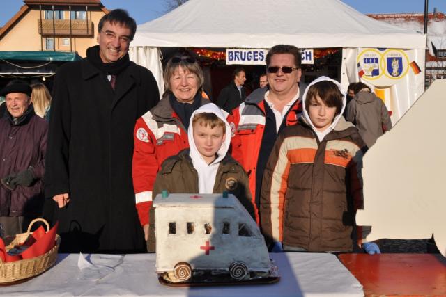 Vorerst aus Lebkuchen- Walter Laub, Roswitha Heitzler und Thomas Baumann mit neuem DRK- Einsatzfahrzeug