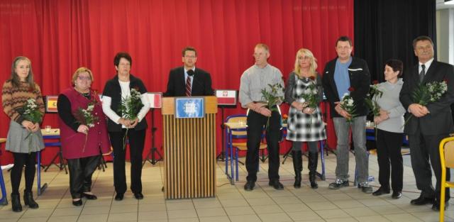 Dankeschön vom Schulleiter Dr. Wolk (mitte): Putzteam, Hausmeister, Sekretärin, Förderverein und Lehrerkollegium